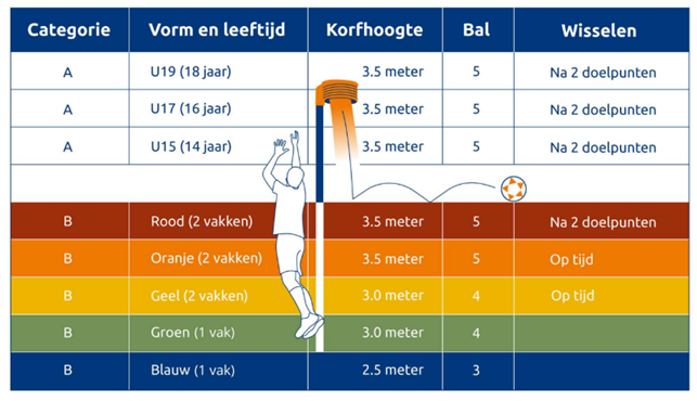 Bij de jeugd wordt er gespeeld in verschillende kleuren. De kleur bepaald de korfhoogte, de grote van de bal en de spelregels. Aan het begin van het seizoen bepaalt de korfbalbond in welke kleur elk team speelt.